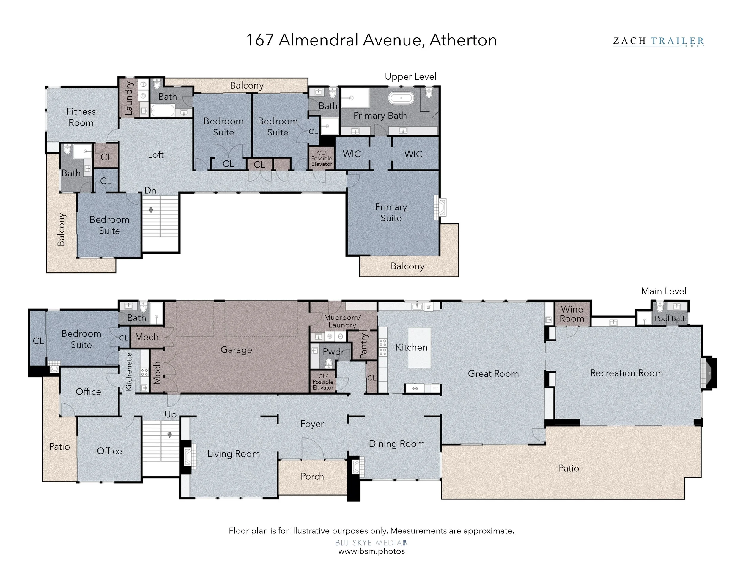 6 bedrooms, 6.5 baths, 2 offices, and on two levels, with gym flexibility and ideal guest quarters